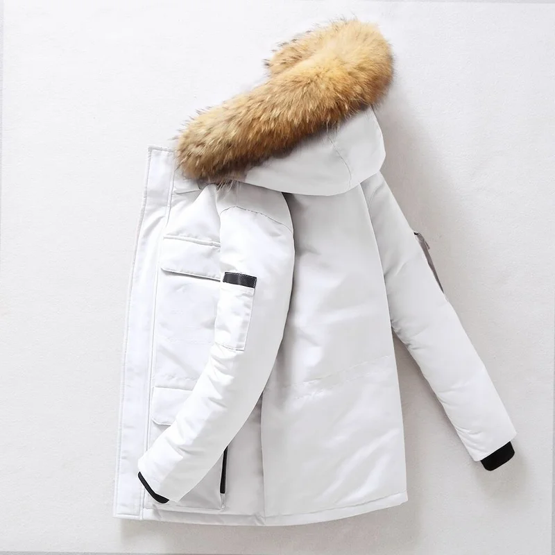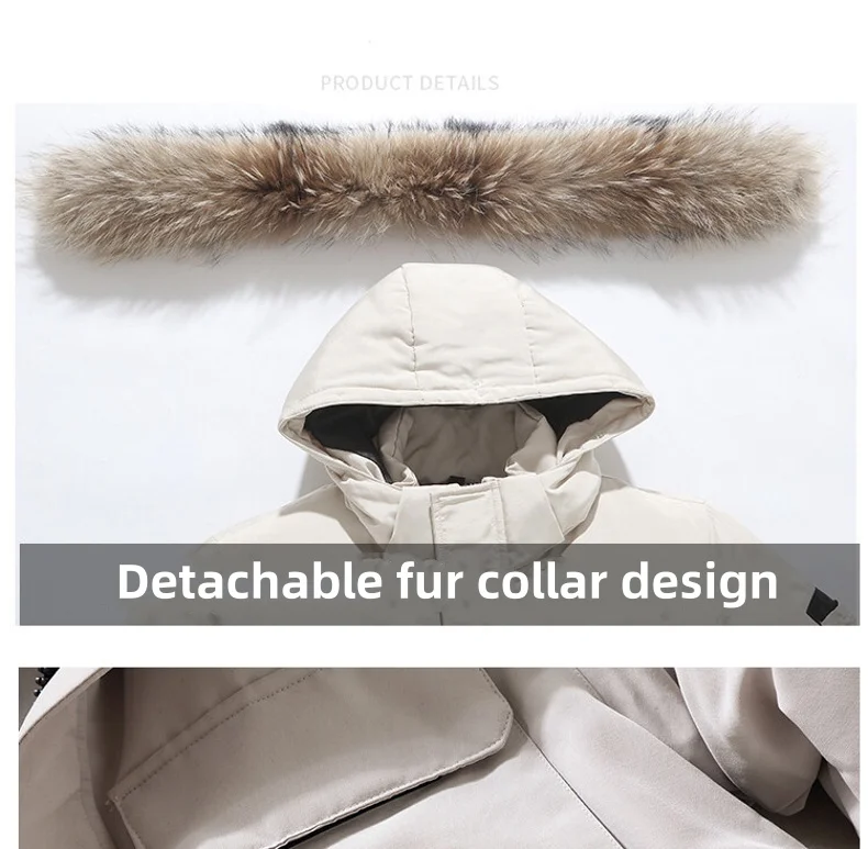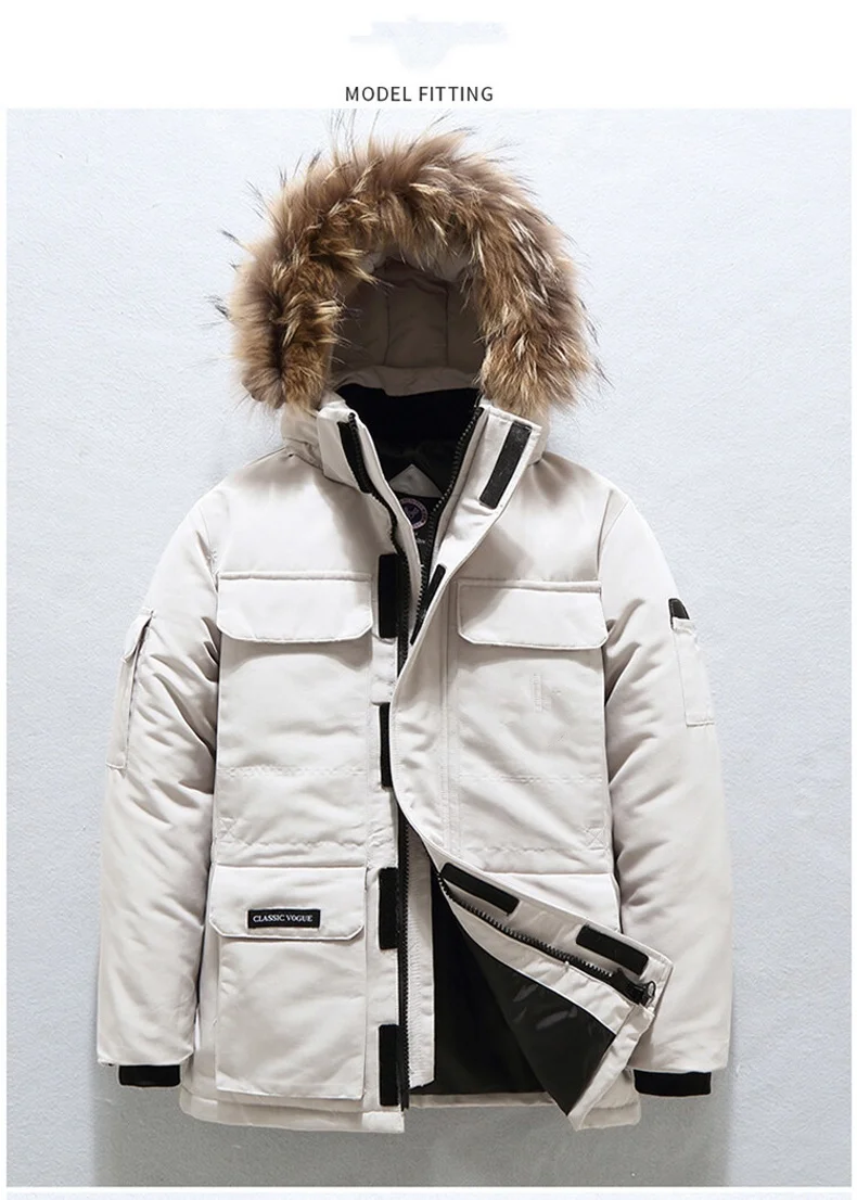 Men’s Winter Down Jacket Fashion Pocket Design Large Fur Collar Windproof Parka Women’s Outdoors Ski White Duck Down Warm Coat